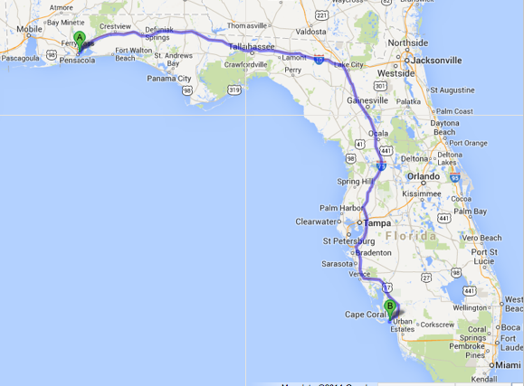 Our trip to Fort Myers, we started around 6:30 in the morning to avoid prime-time traffic. With a couple stops for late breakfast and early dinner, and a couple stretch breaks – AND heavy traffic – and a time zone change – it took us around 13 hours to get there.