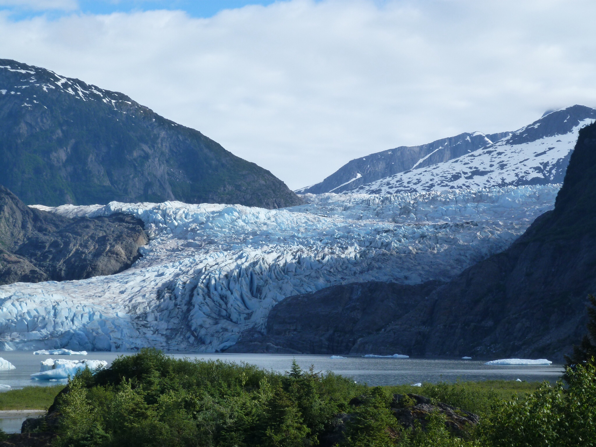 It’s one of those wonderful mornings, we are still on Pensacola time and wide awake. LO, why not, we hit the sack the night before around seven, unable to stay awake another minute. Quick breakfast in the lobby – we brought our own home-mix cereal, but there is milk and fruit we can add, grab a quick cup of coffee, then out to the glacier. When you say ‘the glacier’ you mean the Mendenhall. People havre been coming for years to visit this glacier.