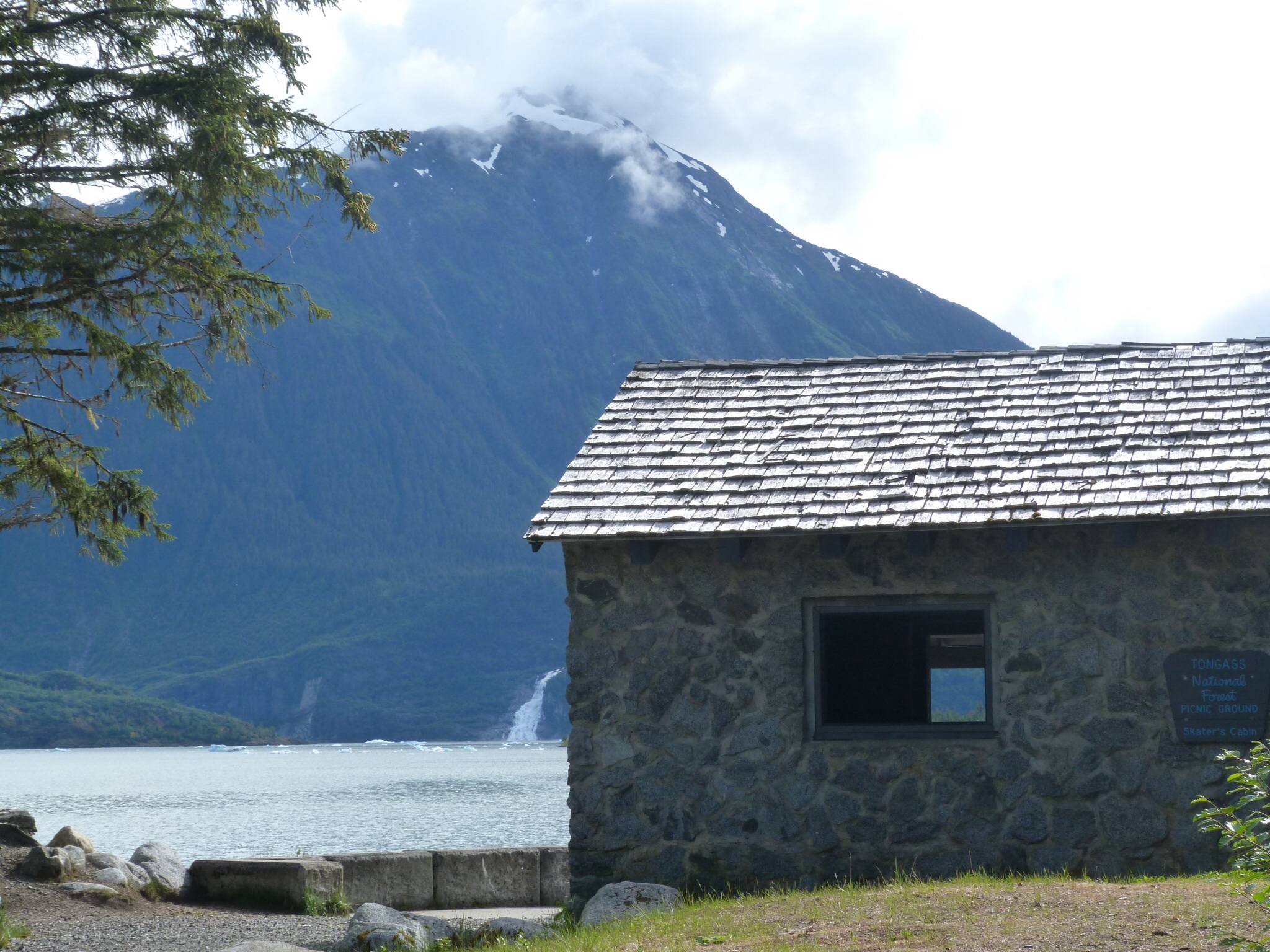 When I was a kid, it was bigger, farther out, and there were only little trails to take out to get closer. Now, it is built up – a place to watch bear catch salmon as they swim up the stream to spawn, and several built up places where tourists can view the glacier, nice paths to walk on. Normally, there are bus loads of people, and I mean that literally. This morning – holy smokes – we are the only car in the parking lot at almost seven ayem.