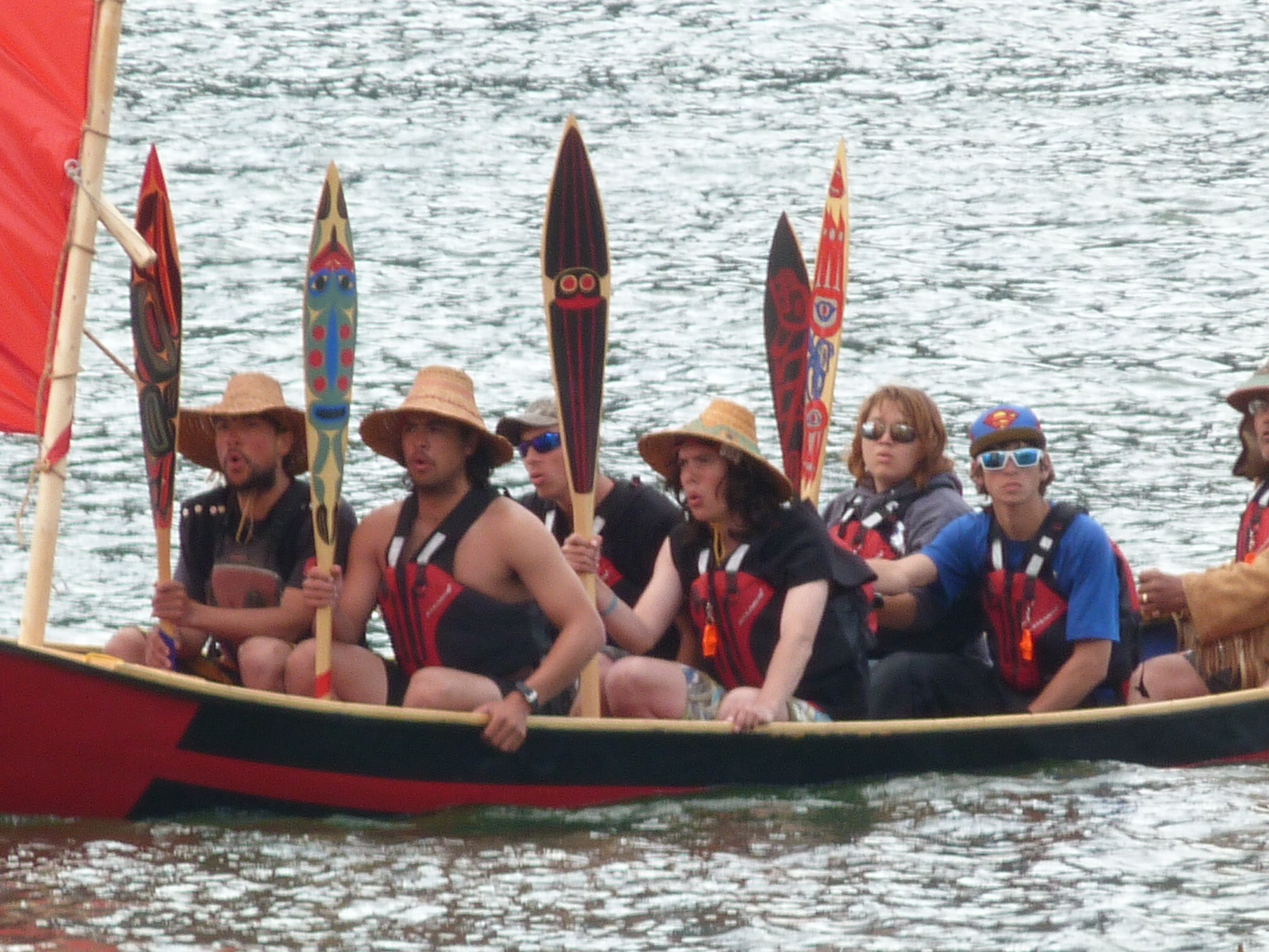 The opening parade was not until evening, so we were on our way to the hotel for a quick snooze and we saw the dugout canoes headed toward Juneau, full of chanting rowers.