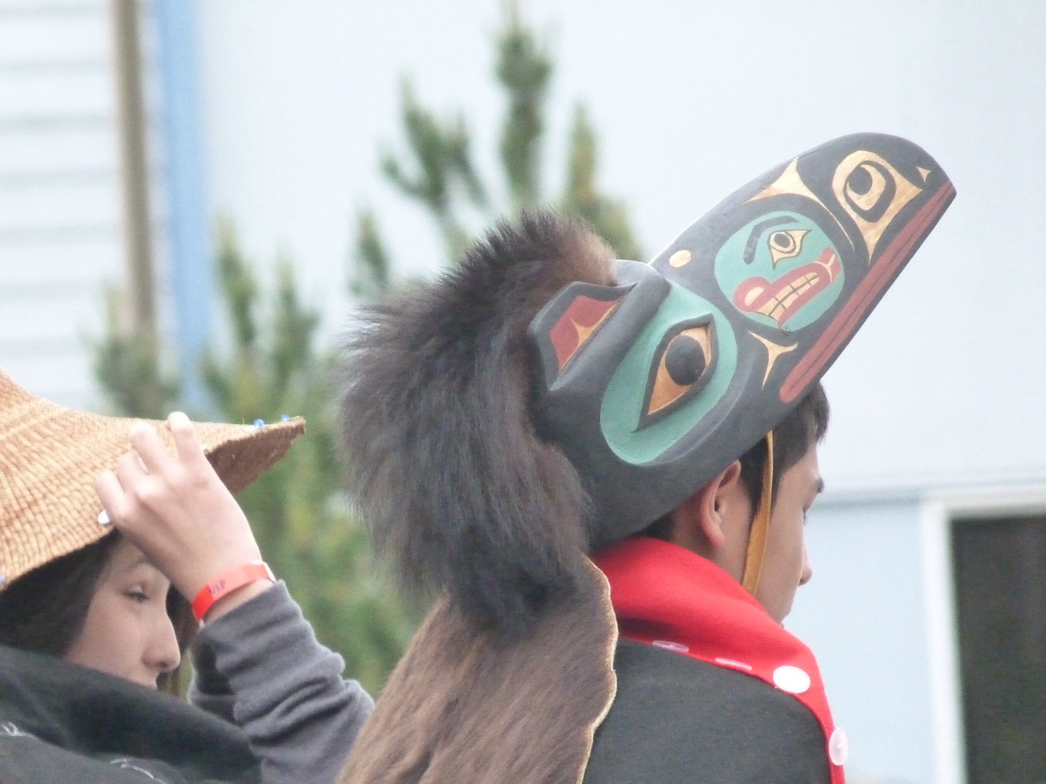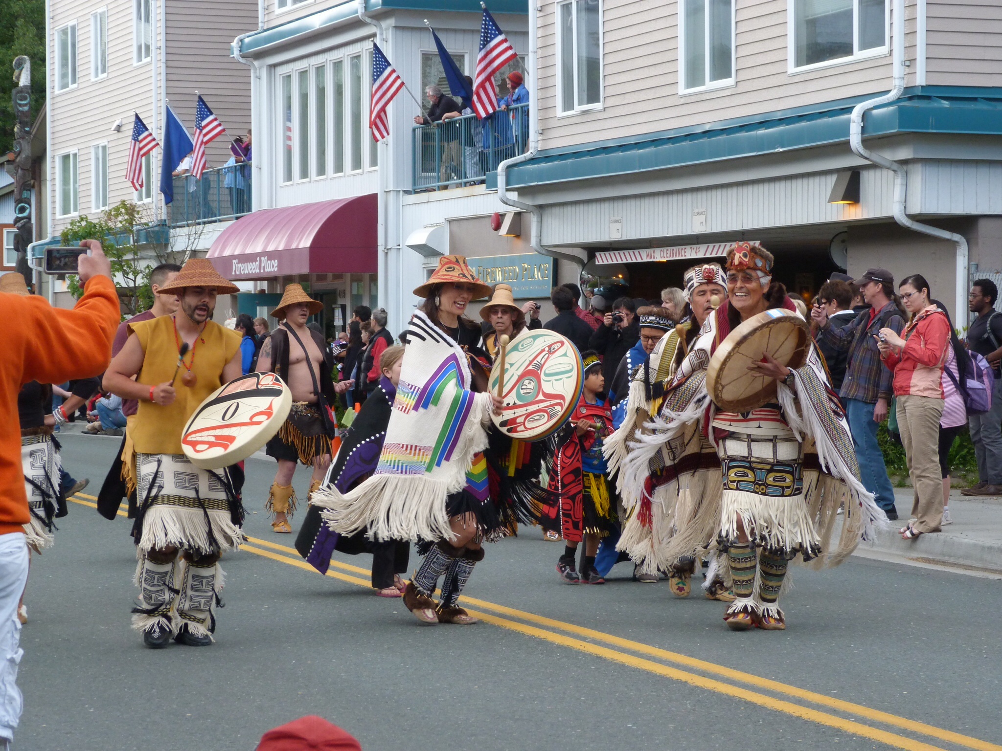 The parade started promptly at 6, led by elders carrying the American flag. Tsimshia’an, Tlingket or Haida – all American. One of the lead dancers was a Marine who took leave to come back and dance with his tribe, leading the younger men in the movements to the hunting dances.