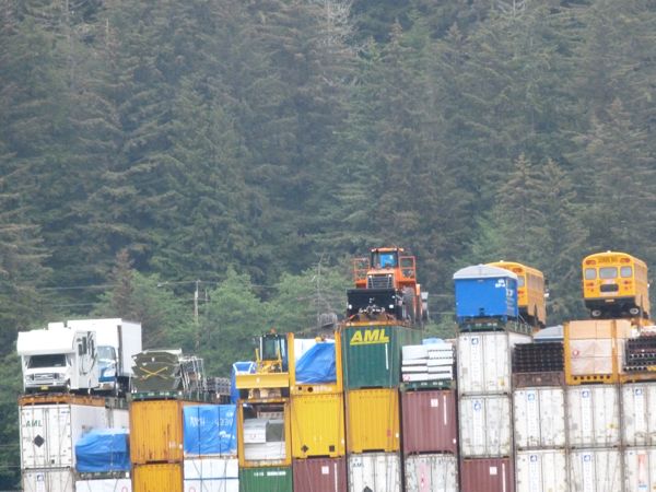 Juneau is landlocked, so everything that comes in or goes out goes by boat or plane. Container barges bring in larger items, and I was amazed how high they can stack a barge. I was also amazed that on top of the containers are vehicles strapped on tight; school buses, campers, snow plows – no wonder everything costs so much more in Alaska!