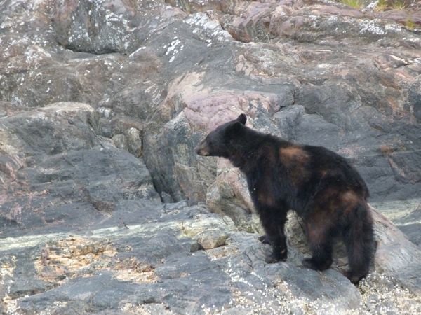 We meet some really fun people as we wait to board – one couple married four days, one couple of young adventurers who, like us, travel on their own as opposed to group travel or cruise ship travel. Our lively conversation made us late to board, only to discover that everyone else had booked for this “sunny” day and every seat in the cabin would be occupied. Once you sit down, that is YOUR spot, oh ugh, this is the worst kind of tour for us, but we discover we can go in and out at will and this works. We spend a lot of time outside, taking photos, watching for whale and porpoise and bear and eagles – all kinds of wildlife. It’s not so bad.