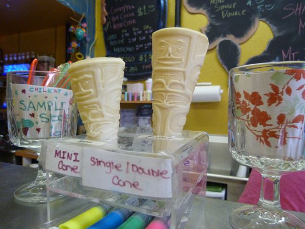 Normally, I don’t eat ice cream, but I have been craving something with either blueberries or rhubarb, two fruits that grew in Alaska when I was a kid, fruits we ate, jellied, froze, stored for later use. I had seen neither. Some might argue that huckleberries and blueberries are not the same. I don’t care. It is close enough for me. I also love that the cones are so extraordinary, artistic even, with their Alaskan Haida-esque sculptural quality: