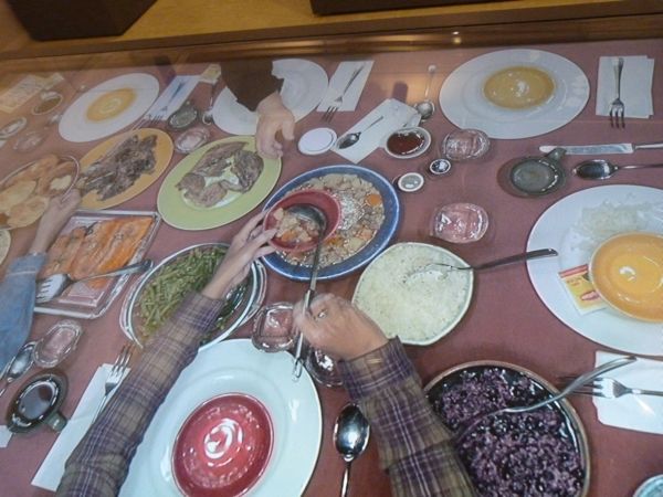 This presentation was like a table, but the movie was on the table. There were foods, and it was like we were the people eating. Someone would pass a dish and explain a little about what it was, like whale blubber or seaweed something. As much as I like to try new things, some of what they had on the table was stuff I would cut into very tiny pieces and push around the plate so it looked like I had tried some but I didn’t. I loved the presentation; so interactive.