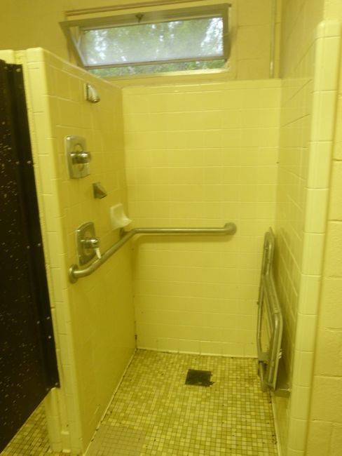 Campers are allowed to do ‘primitive camping’. I didn’t know what primitive camping was, but as it turns out, it’s what we used to do when I lived in Alaska. You bring everything yourself, you hike with everything on your back. There may be some paved areas, or minor structures, but you have to have brought everything you will need with you. No cabins, or things like that. There are, in this park, public restrooms and public showers. This shower is too public for me!