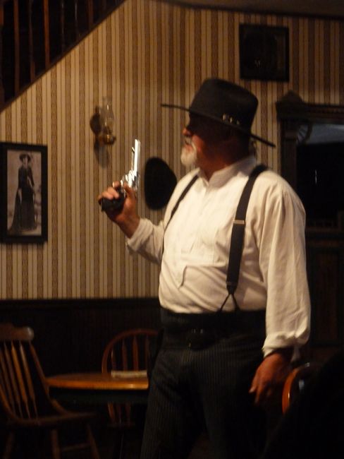 As we walk into town, we come to a group of cowboys telling people the big gun fight re-enactments will start shortly, and to buy our tickets at Wyatt’s coffee shop and go next door to the ‘saloon.’ At this point, we hear a volley of gunshots, loud bangs that go on for about 22 seconds (LOL) and so we ask “What was that?”