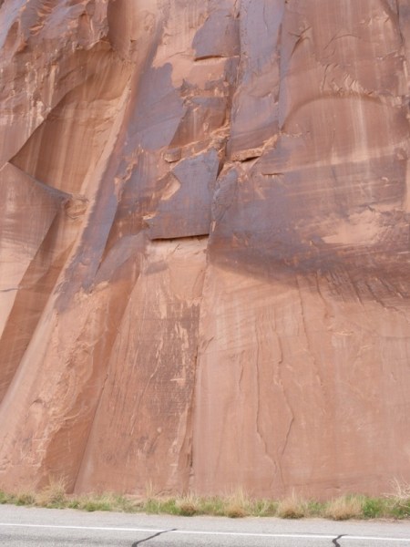 First, the road follows the Colorado River flowing along swiftly, full of rafters and boaters. Then you come to the cliffs about 5 miles in which are used by the climbing and rappelling schools to teach rock climbing, and there must have been fifty separate people working their way up and down the cliffs. This is not for the weak in body; we saw one dazed and damaged young man being loaded into an emergency vehicle for transport back to the hospital. Just past the rock climbers is the first set of petroglyphs, which are really hard to spot, about 20 feet off the ground, but once you get the hang of it, you start spotting them everywhere.