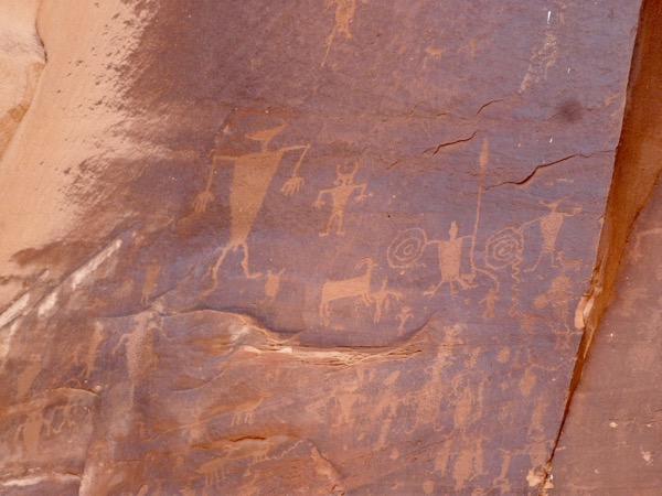 After our long hike, and our fabulous lunch, we took a short nap, then headed out to find ancient petroglyphs and pictographs. (Pictographs are painted on, petroglyphs are incised out.) Potash Road was near the entrance to Arches National park. It looked like an ordinary road, even a farm road. Once again, a road that started out looking and sounding inauspicious turned out to be a lot of fun.