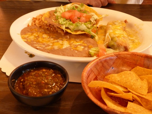 AdventureMan had Tostada and Enchilada. See that salsa? That salsa is one of the best salsas we have ever eaten. In the photo it looks red, but it actually was very green.