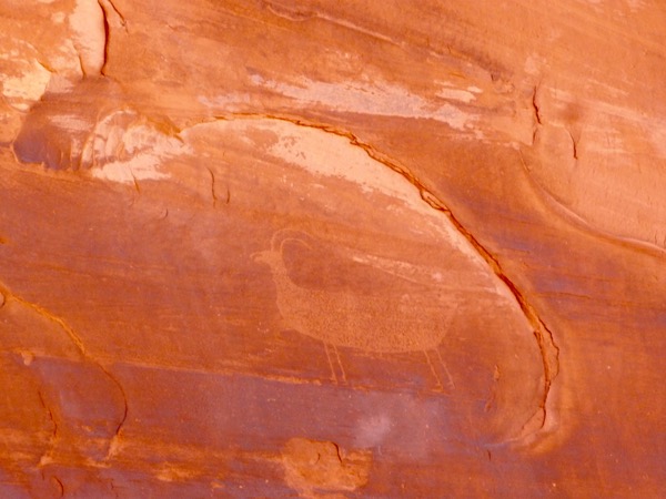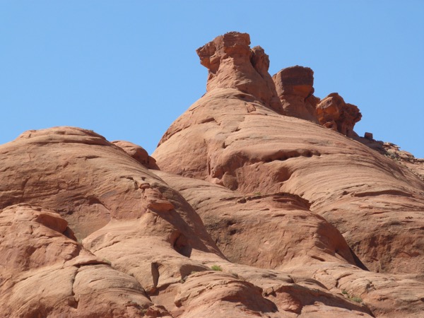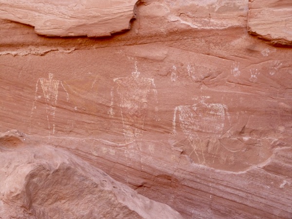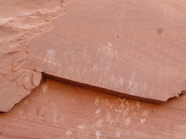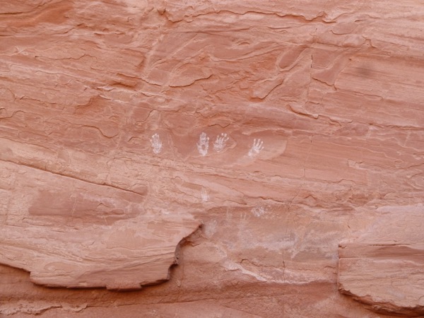 While it was still cool, we hiked up to some dwellings, straight up the red rock. I didn’t have any problem going up, I wasn’t worried about going up, it’s always going down on rock where I worry – loose pebbles can make your foot slip, and there are no soft surfaces on the way down. I did fine, and I thought AdventureMan did, too, only to learn when we got back to the hotel at the end of the day that he had actually slid and tumbled badly down one rock slope when he had gone up to photograph some hand prints in a location that I would not attempt.