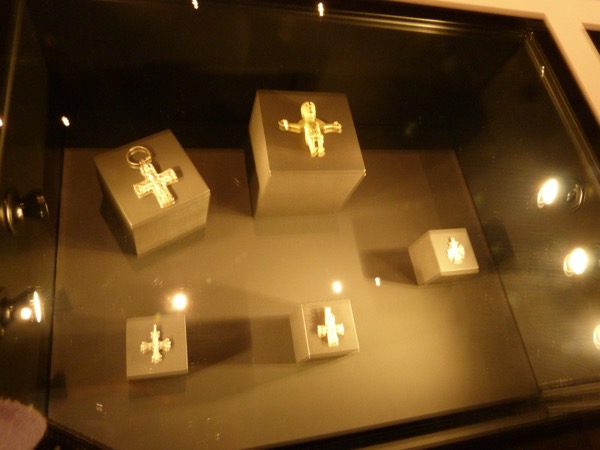 Another of my favorite exhibit, and almost impossible to photograph. These are nails, exactly in the positions they were found. An entire Viking ship had been found, buried in dirt and mud. The wood all rotted away, and disappeared, but the nails stayed exactly where they had been, and in the exhibit, thin, nearly invisible lines hold each nail in its place. Together, the nails form the shape of a ship, but you have to find the right perspective to see it. I tried, this was the best I could get.