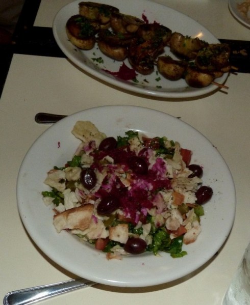 First out was hummus, and mohammara, and a big basket of hot hot hot fresh pita bread. Oh! I had forgotten how good it tastes, fresh out of the oven, and so plentiful. We were so happy, we stopped even thinking about the rest of dinner.