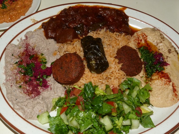 A while later, our dinners appeared, and they were each wonderful. AdventureMan had a felafel sandwich, which I failed to photograph. I had ordered this wonderful vegetarian platter, which I was happy to share with everyone.