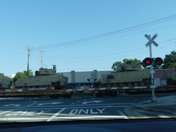 I’m on my way home from the Y, and the gates go down and a train goes by. Car after car go by, and each segment has an armored personnel carrier, a sturdy military truck, or a desert jeep.