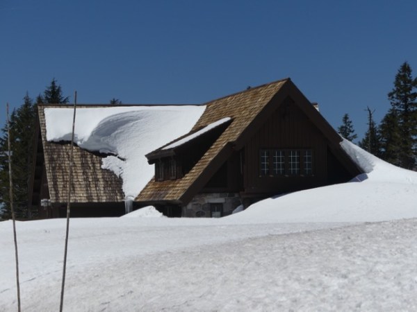 We stop at the lodge to buy post cards; it really is open, there is a temporary tunnel that you can take to get inside. Below is our rental car; you can see how high the snow level is.
