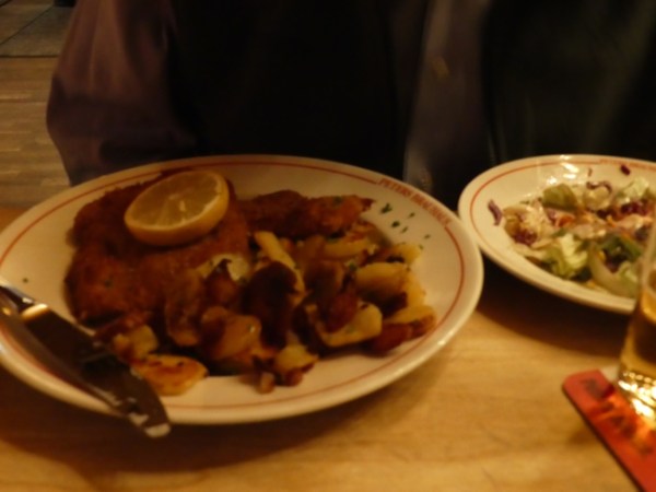 AdventureMan had a schnitzel and house fries, with a salad and a beer. Kolsch, of course.