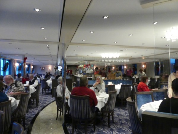 The dining room is not intimidating. There is always room. There are only maybe 100 passengers on board, so by the end of the trip we have favorite people we like to see and talk with at meals. The food was pretty good, too. I can’t drink a lot of wine any more, but they had a Sancerre that was cool and crisp and dry and went perfectly with fish. They had a good number of options at every meal, soups, salads, main courses and desserts. One person I saw even ordered two main courses; I’ve not seen that before, but it seems that Tauck really takes good care of demanding customers.