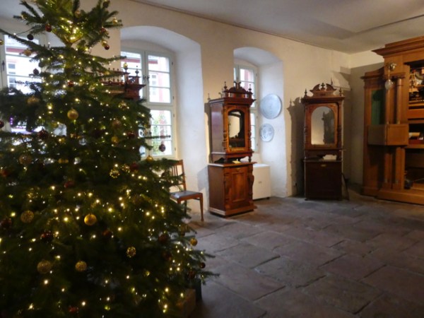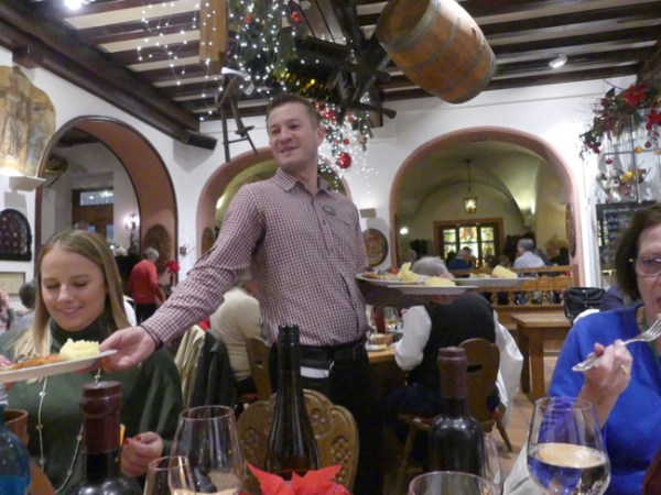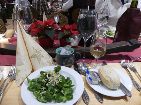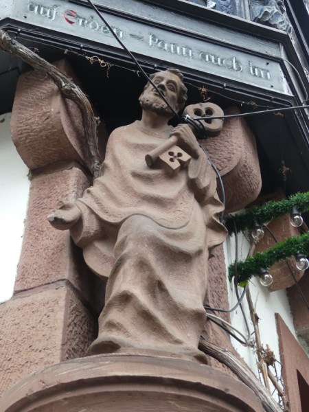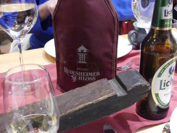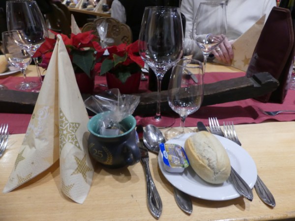 After the music museum, it was time for lunch. We have to give Tauck Tours a lot of credit. Most tourist companies contract for a “good enough” meal, and when we heard “a typical German meal” we had thought we might go off on our own, as we often do, but the idea of lunch at The Rudisheim Schloss (Castle) intrigued us. We were glad we chose to join the group; the meal was done well, starting with a carrot soup and a good traditional German salad, then a schnitzel made with good meat, accompanied by potatoes (I think) and bottles of very nice wine. At each place was also a cup, a gift of the house, in which we could have infinite refills of the Christmas gluewein, spiced wine, all day long.