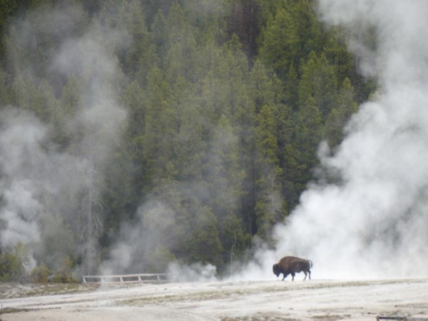 I love this photo, which I owe to my husband. we were out for a walk after dinner and he spied this old bison in front of the steaming geyser, just walking along, not at all concerned about the dangerous ground.