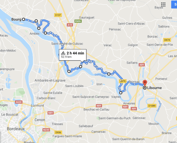 Google Maps won’t give me boat routes, but they will give me bike routes, which I can maneuver to give me a simile of the route the Forseti travels to Libourne.