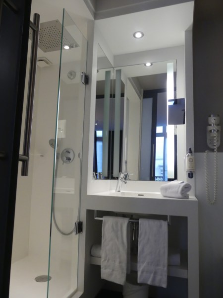 The bathroom is also spacious, and very modern. It felt roomy, especially after the ship. Lots of towels, and big thick cotton bathrobes. The controls on the shower were sort of space-ship modern, you move this knob this way to control volume, and that ring that way to control desired heat, and how do you raise the shower-head and make it stay exactly where you want it? But it wasn’t rocket science, and once I figured it out I explained it to my husband. We ran into this configuration several times.