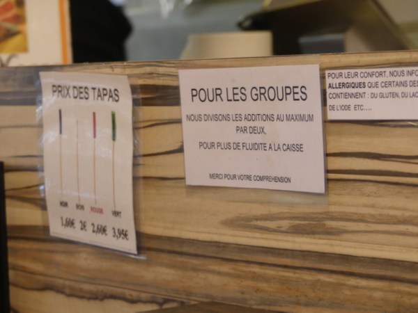 You pick out a variety of little tapas sandwiches and pay by the color of the stick.