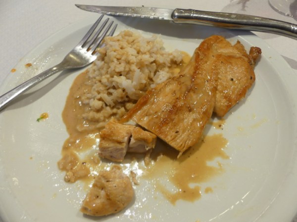“I’ll check with the chef to see what is left,” she tells us, and hurries to the kitchen. Coming back, she points to the daily special and tells us we are in luck, that there is still a little left. It is turkey. We are hungry. Fine with us.