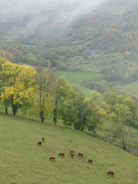 We had stayed at a hotel called Hotel Les Remparts, which had a fairly simple menu with steaks from local cows; many of these same cows were in the valley below the hotel, busy munching and making the milk which goes into the famous Cantal cheese.
