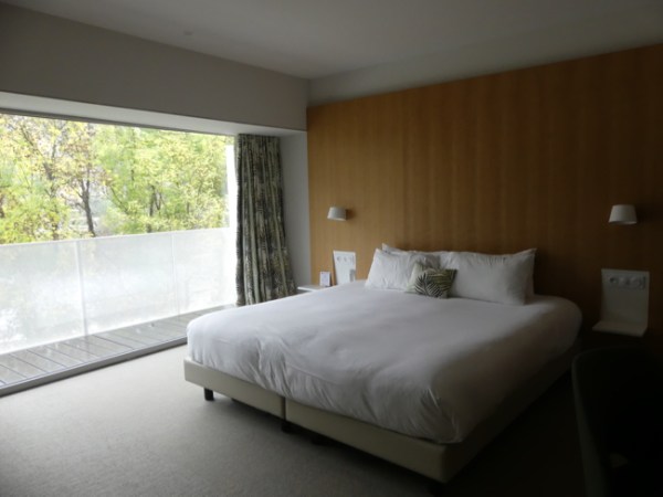 When we walked in, we received a very cordial and friendly greeting; the receptionist was Dutch and spoke English wonderfully. She told us that at seven, the parking machines are no longer monitored, and we are safe until ten the next morning, so that was a relief. She showed us to our room. You can see our room in the photo of L’Esplanade from the path, above; it is the corner room, one story up, and has a balcony.