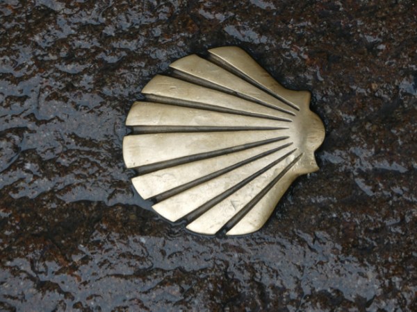 It is a church on the pilgrimage route, however. AdventureMan, with his sharp eyes, spots the telltale scallop shell on the street we find to go back to the hotel. It’s raining hard. We don’t even window show, we just scurry back to the hotel.