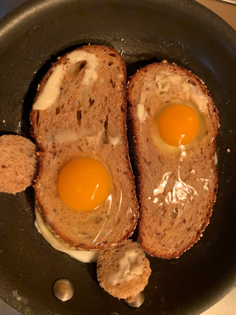 She watches me cut the hole, butter the bread and turn on the stove. She is attentive at my elbow as I break the eggs into the holes. (She says she is not ready to do it herself.) And then, as it cooks, she loses interest and runs off to chat with AdventureMan.