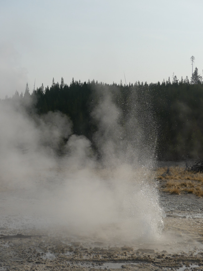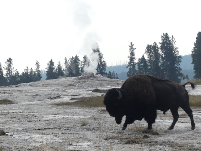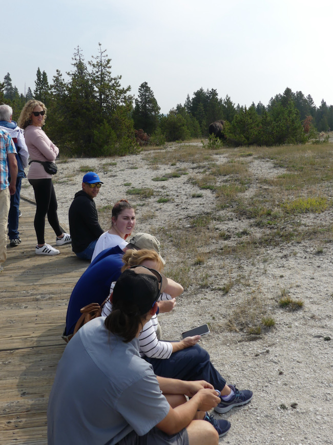 We could watch Old Faithful erupt from our front row seat, but we decide to leave our location for someone else, and to hike out to another vantage spot good for watching the eruption. It is a great walk, we find a good place and just as I am about to walk to the prime location, a family stops there and claims it. We sit nearby, and a bison comes near. The family can’t resist, they decide to follow the bison, so we get the place after all.