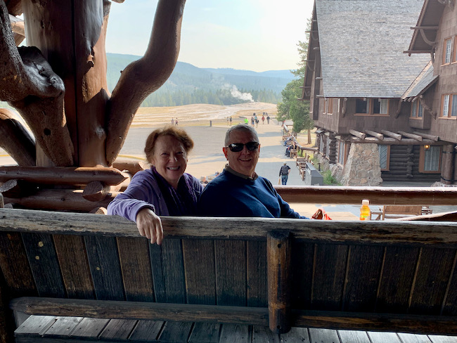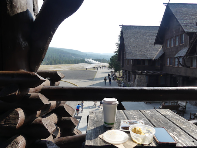 We head on to Old Faithful. There is a long boardwalk there I have never walked, and we have little hope it will be uncrowded. We decide to have breakfast first, and discover the dining room is not open, does not seem to be serving meals at all. The grill is open, all grab and go, so we pick up breakfast and for me, coffee, and ask if we can eat on the terrace. They tell us yes, so we head upstairs, and there is a lovely spot with a bench and two tables overlooking Old Faithful, so we set up there and have one of the most unexpectedly lovely breakfasts of our trip.