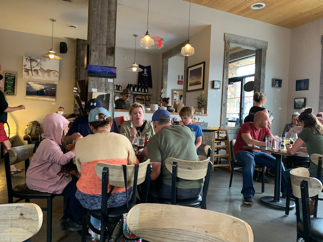We went into Gardiner for dinner, to the Wonderland, a restaurant we discovered the last time we were in Yellowstone, a couple years ago. We were astonished – we went early. Almost every table was full! They did have a table for us, and we were very grateful. I had trout with aioli sauce, AdventureMan had elk chili (it was sprinkled with powdered sugar, and was sweet!) with their famous jalapeño cornbread. Wonderland was hopping busy; we were so impressed with the way the team all worked together. While the servers were taking orders, others would be taking plates away, filling glasses, bringing food from the kitchens – everyone helping each other. It was awesome to behold.