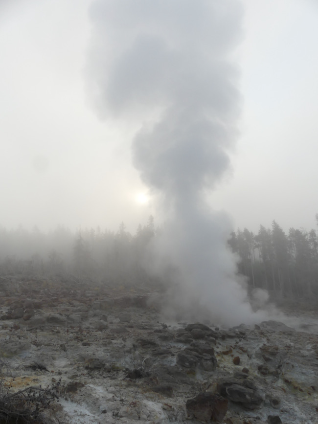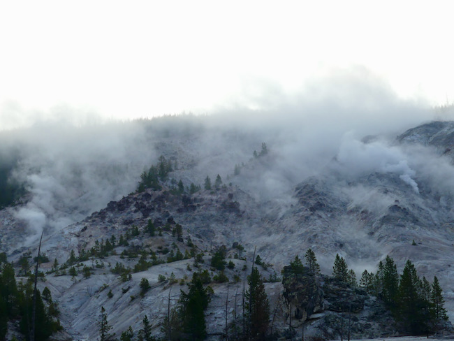 On the way, we stop at Roaring Mountain, another of my favorite spots. It is a cloudy day, but that is OK at Roaring Mountain, a sulpherous, misty site full of fumaroles, holes out of which pour hot steam. In the cold morning air, the steam shoots out, and then billows dramatically around the mountain.
