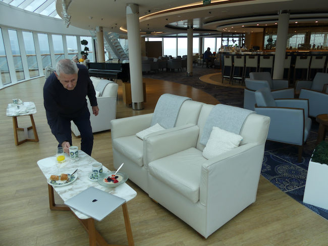 Little I can do but working on this journal in the Explorers Lounge before AdventureMan wakes up.