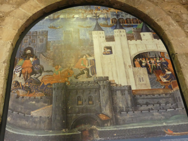 (detail on a painting in White Tower:Β βDetail of the earliest known image of the White Tower showing the buildingβs exterior. The view includes a cutaway to reveal people in an invented interior. From a late 15th century collection of poems by Charles, Duke of Orleans, British Library) Royal MS 16F11:173β (?)