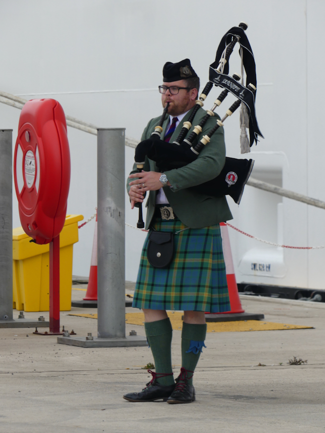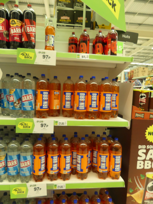 When we get back to the port, we decide to explore a little before heading back to the ship, so we look for the grocery store the guide has told us about to see a little of how the real Scots live, or at least where they shop. It is an Asda grocery, but once inside, it sure has the feel of a Walmart, with signs about price rollbacks and arrows, clothing racks and foods – its a supermarket, not unlike you would find in France or Spain or Pensacola. The goods are goods like we would buy in Pensacola. We just see one thing we know is genuinely Scottish: