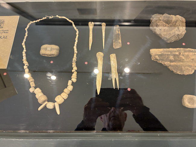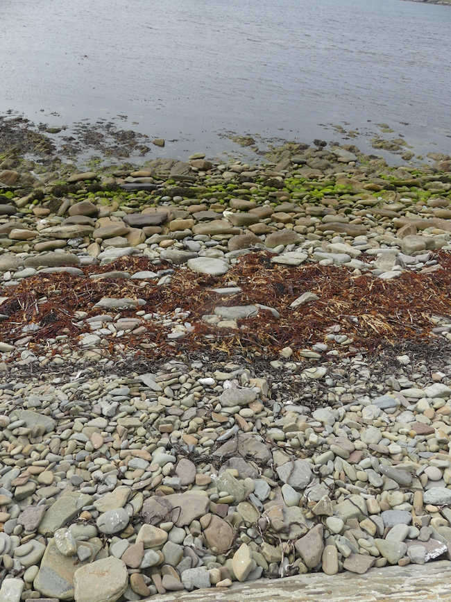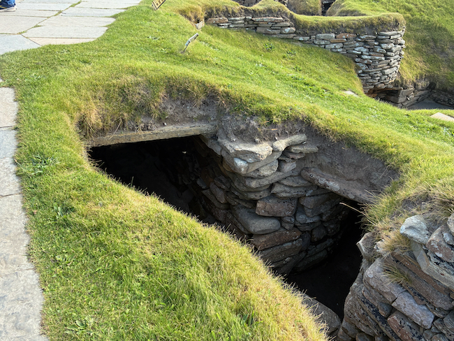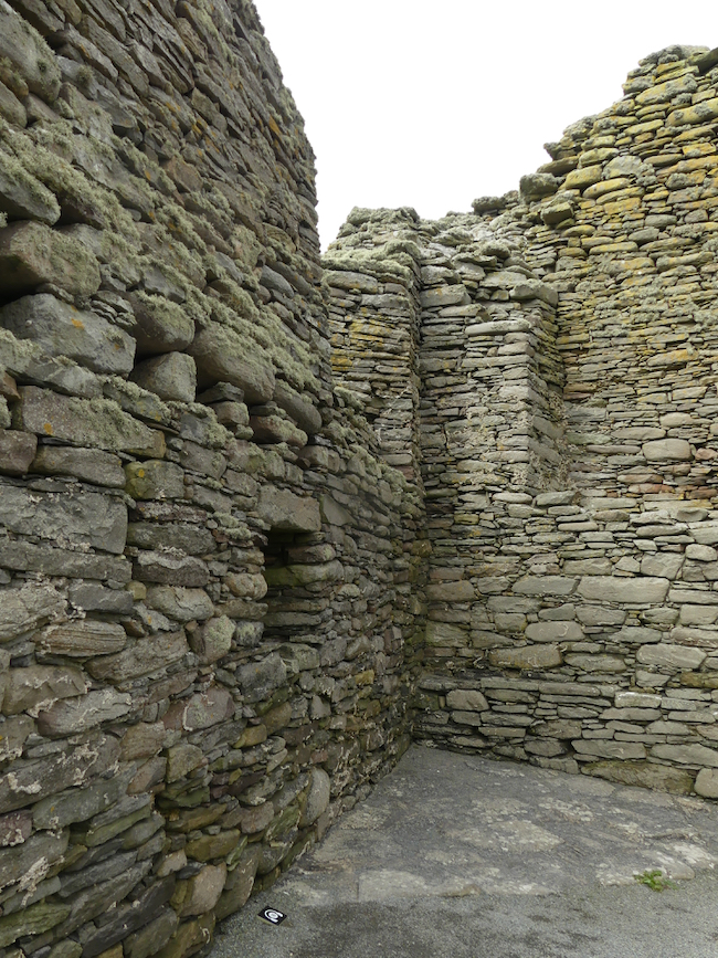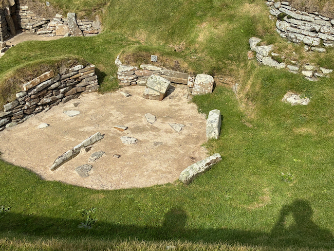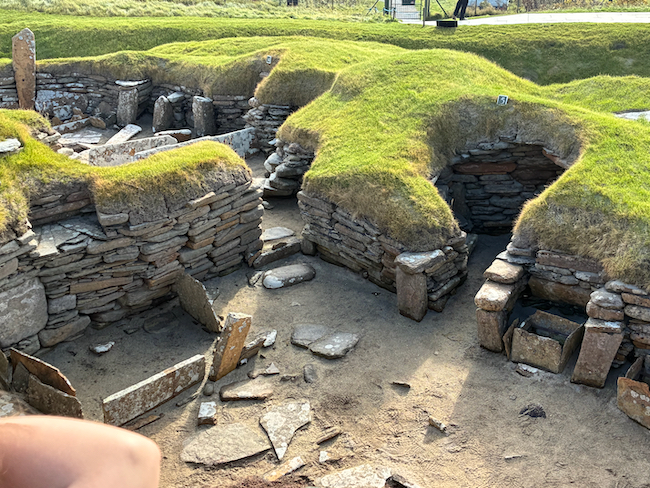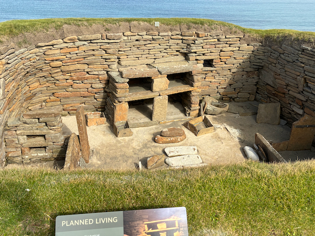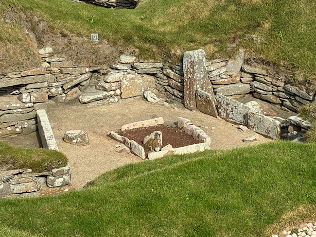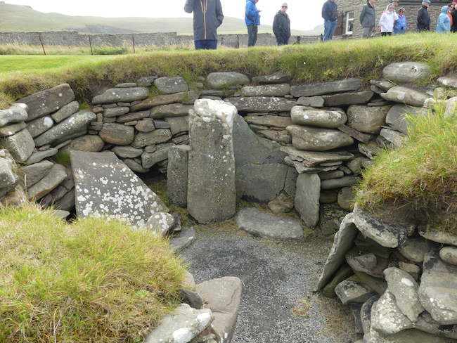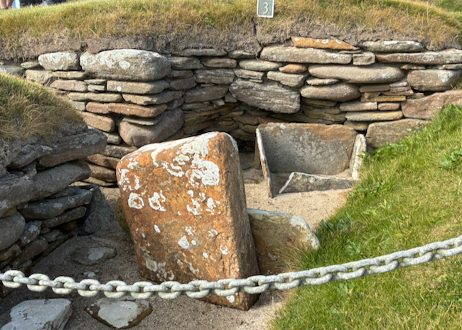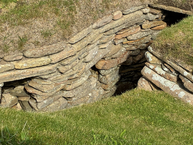 Look how closely these stones fit together to keep the earth out of their houses, fitted without mortar. Our archaeologist guide tells us there is no way to date a stone wall like this, that the inhabitants of the Orkneys build their walls the same way to this day, only now they also use mortar. Traditionally, they will put pointy flat stones on top, vertically, to discourage sheep and cattle from trying to get in (or out). In the museum there are artifacts – combs, needles, tools – which help date the findings.