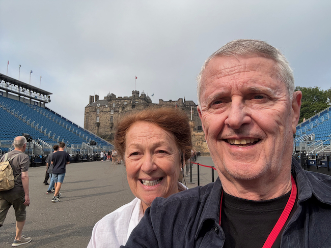 They call our group quickly after group one (Group one is going to play golf at Saint Andrew’s; we are going on the panoramic tour of Edinburgh which is riding around in the bus about one hour looking at important things, then walking up the King’s Mile to the Edinburgh Castle. It is August, the month of the Tattoo, and the Castle has huge grandstands set up for people to come and watch this historical ceremony.