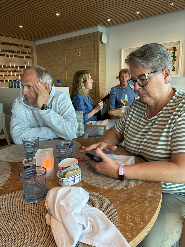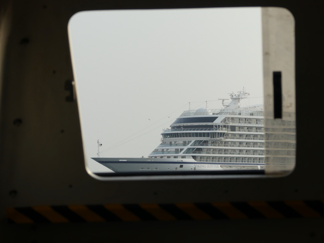 One thing you don’t get on a cruise ship is a lot of quiet. Viking ships are quieter than most, but you get 900 people together, there’s going to be some noise. For the first time ever, we have a loudly quarreling, quarrelsome couple on one side of us. Fortunately, it is sporadic, not all the time.