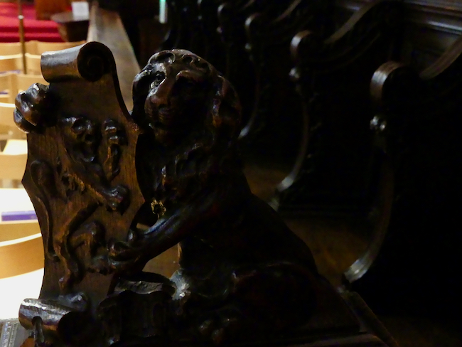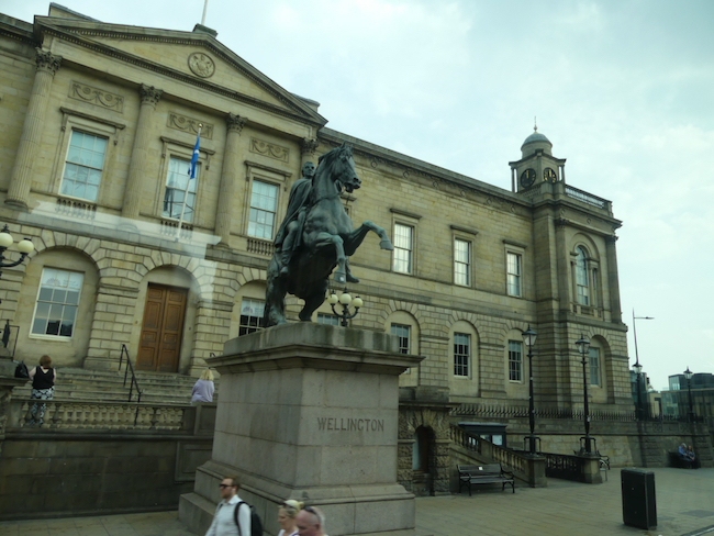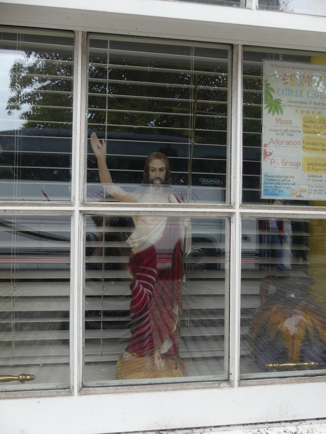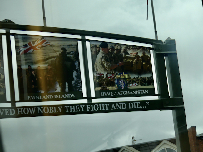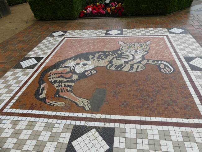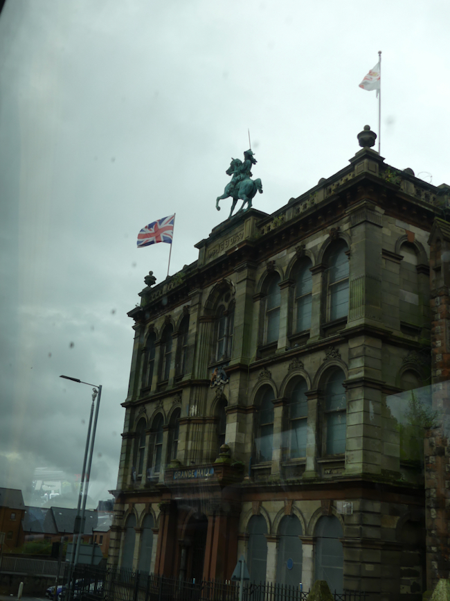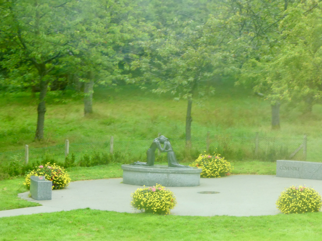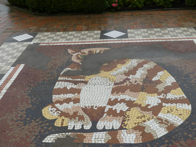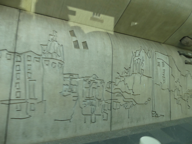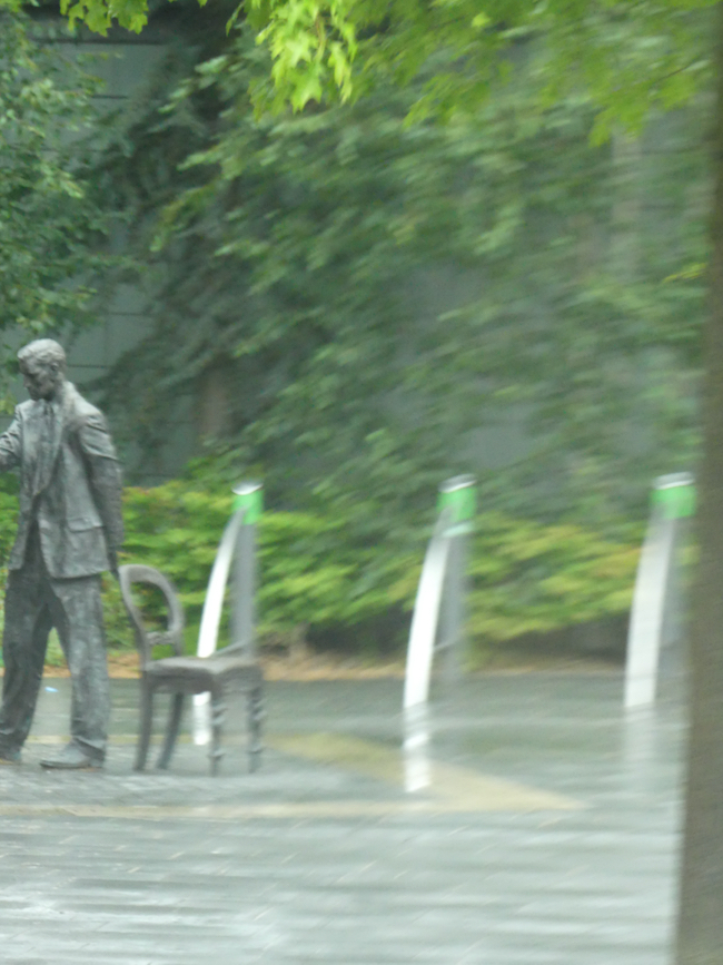 I apologize for the quality of these photos, taken as best I can from a bus with rain-drop smeared windows. Below is a square in homage to the author C.S. Lewis. Under that is a statue of his lion from the Narnia series.