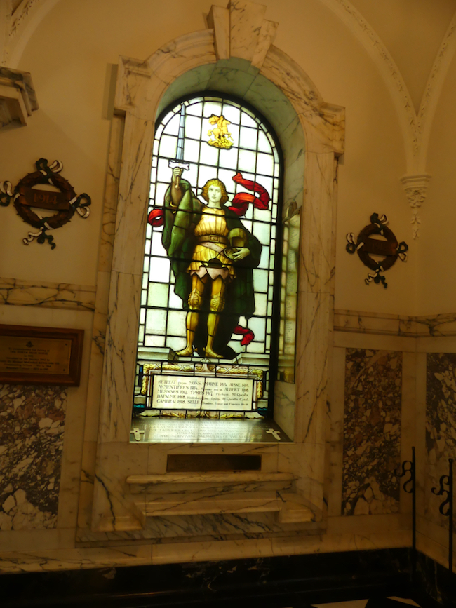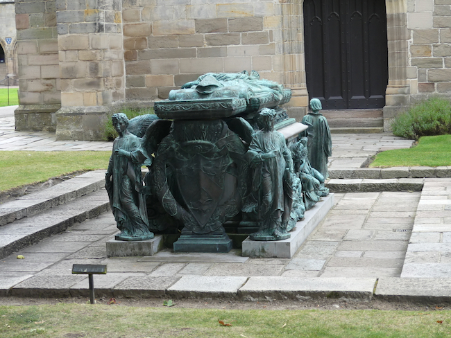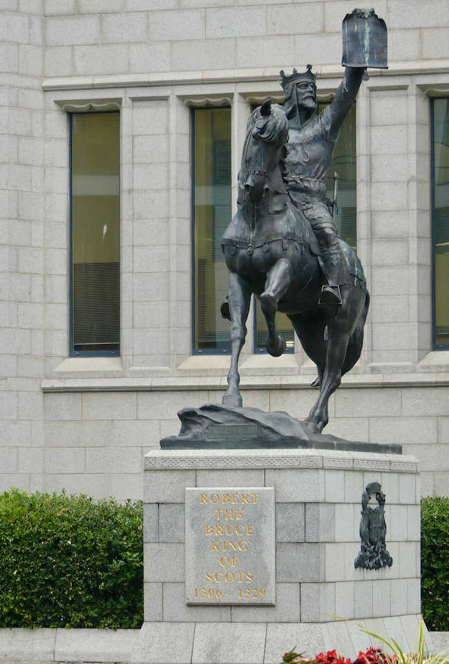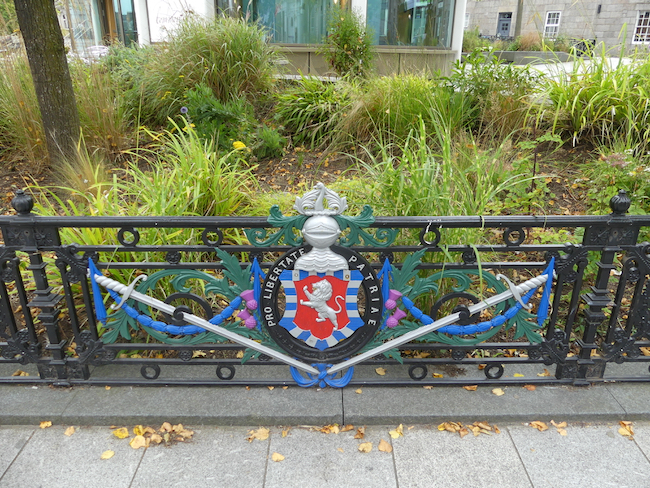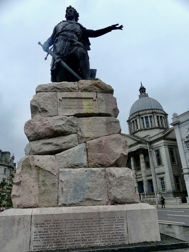 Then we stop at Union Terraces, surrounded by the King’s Theatre, St. Mark’s Cathedral, The Andrew Carnegie Library, and a modern apartment complex built around an old church tower. We visit an impressive statue of William Wallace; Andy tells us to be sure to read the inscription and narrative at the bottom of the statue: