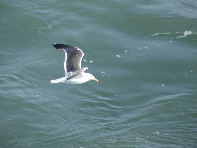 Today, it is cloudy, but they are high clouds, and foggy, the kind that burns off by late morning, and AdventureMan spots a seal sporting in the Viking Jupiter wake as we are docking.