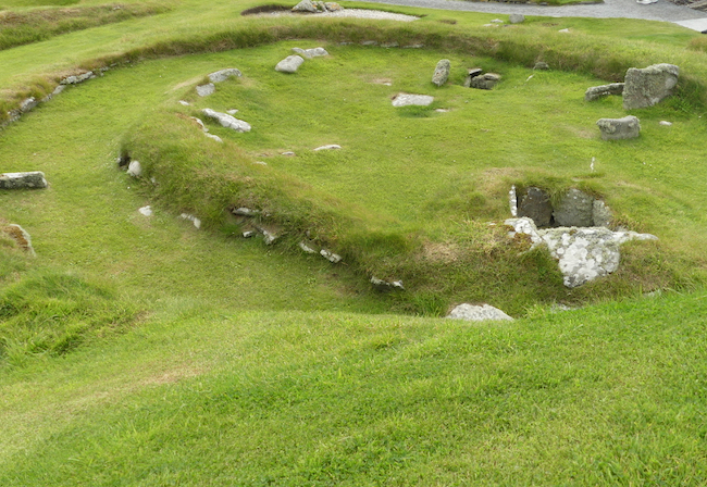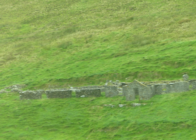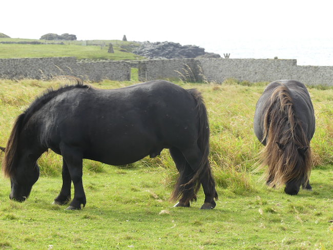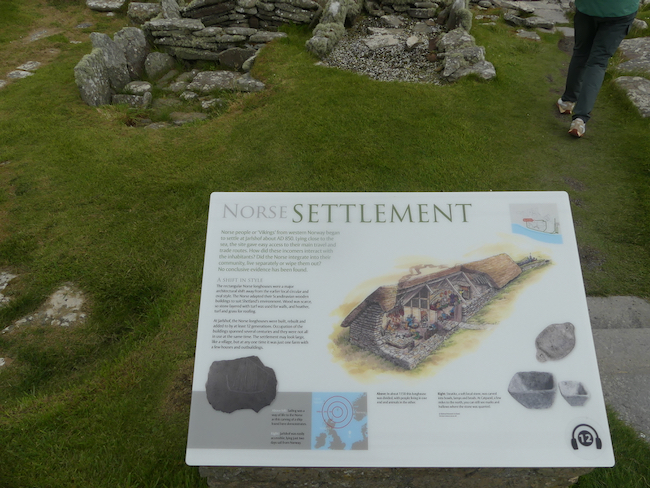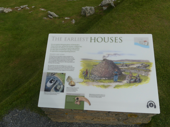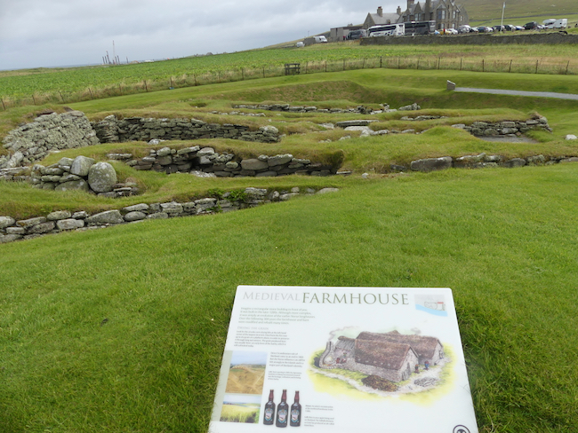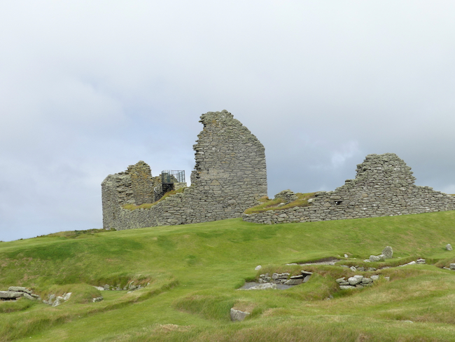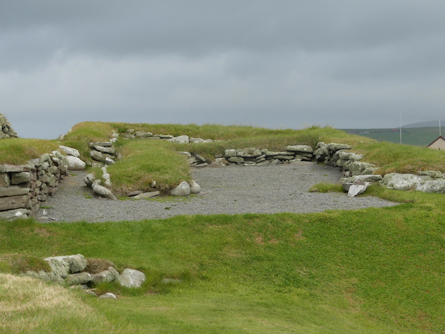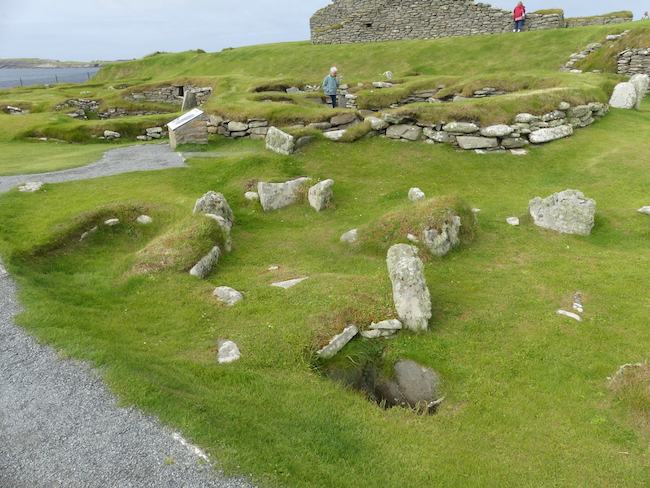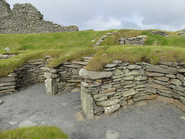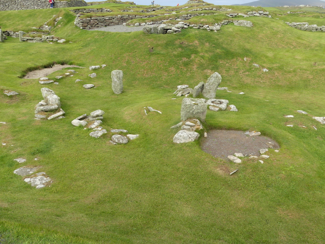 We reach Jarlshof, literally the house of the Earl, and there is a ruin of a medium sized stone house with more-or-less modern dimensions. The treat, though, is that (like Scara Brae in the Orkneys) a large storm uncovered ruins of dwellings dating back more than 4,000 years, built partly underground but covered by sand over the years.