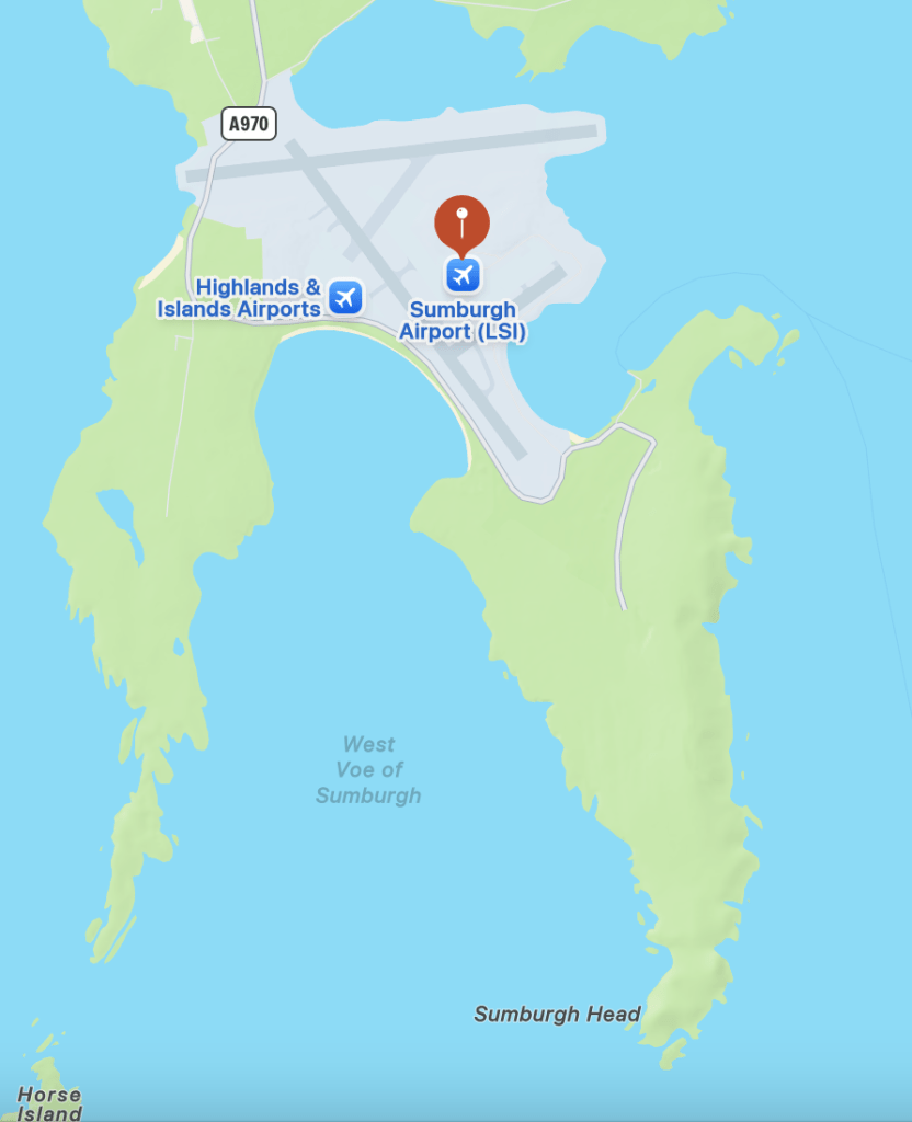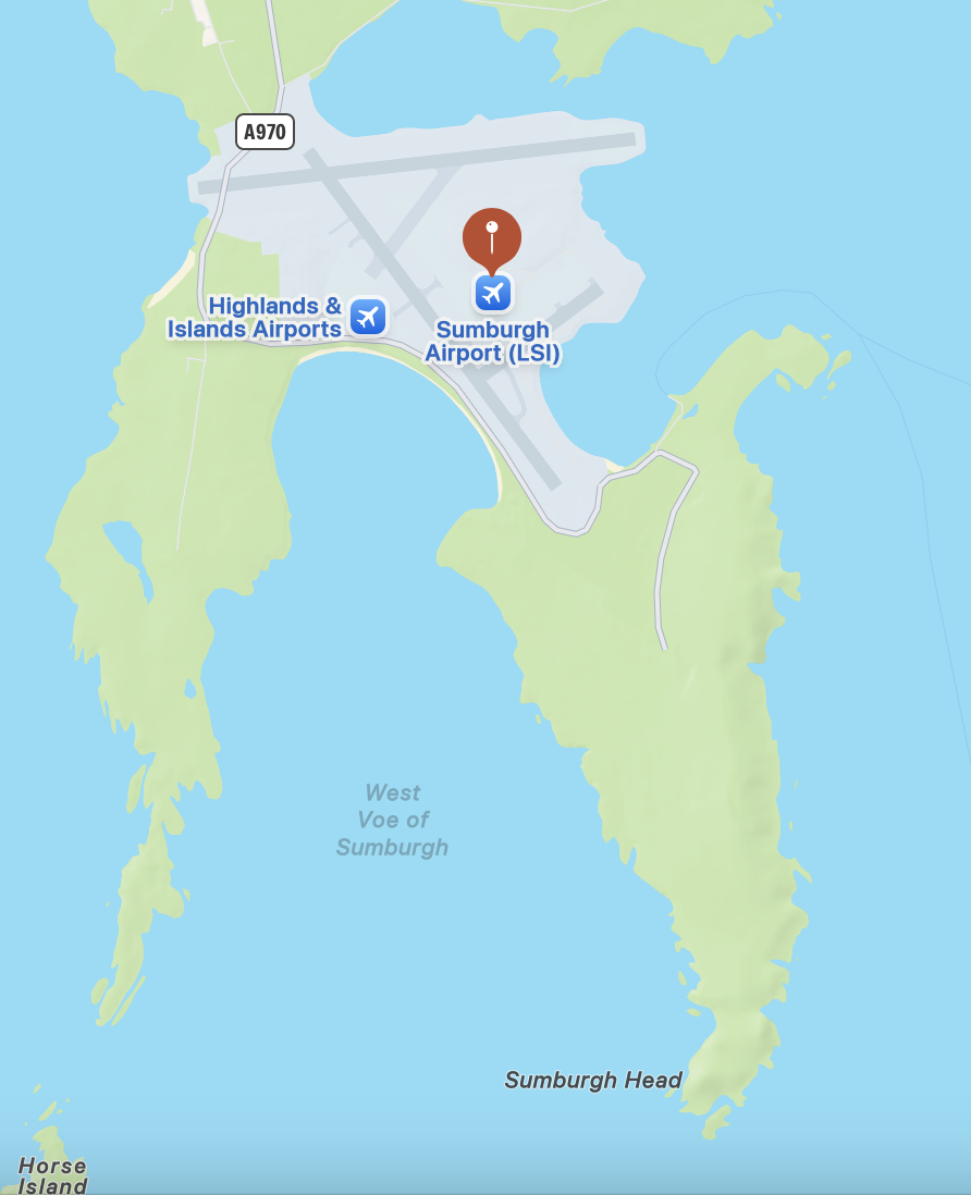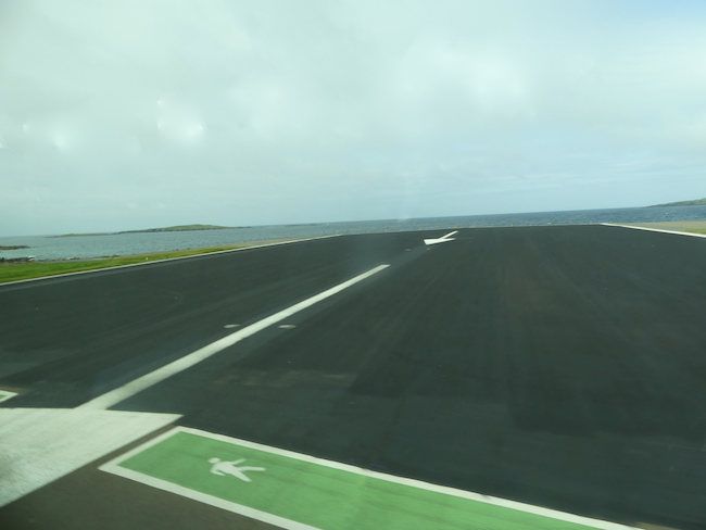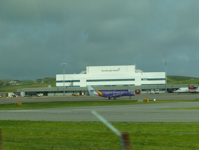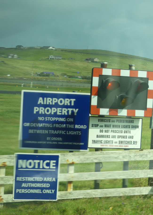 Leaving Jarlhof, we are stopped by a gate across the road and a red light. The road crosses the airport landing strip, and a plane is landing, stopping all traffic in both directions until the gates are lifted once again. We watch the plane land, and then we proceed. I’ve since learned from Ann Cleeves that this is Sumburgh Airport, into which investigators and medical examiners fly from Aberdeen when there are all these murders in Shetland.