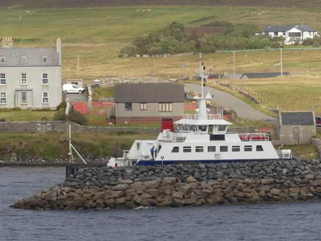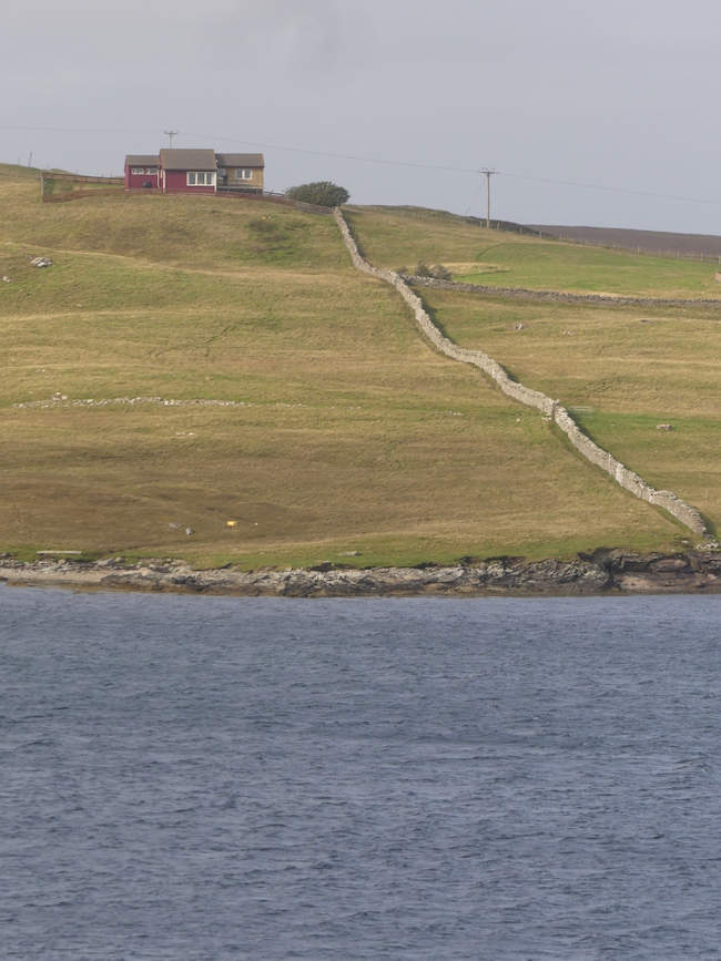 Our ride home is beautiful, again the hills with sheep and cows and ponies, even a few goats. We see small farms, we reach Lerwick where the Viking Jupiter is docked and see granite and sandstone buildings, a high street for shopping and modern supermarkets. Our guide is very proud to tell us that most of the shops in the Shetlands are privately owned, with very few chain stores. Shopping is more personal. Mail order through the internet is iffy – because everything has to come in by air or by sea, weather plays a big role, particularly the wind and rain, and no one guarantees “next-day” delivery.