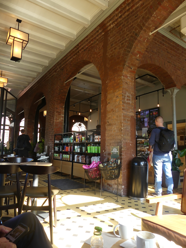 Strange experience with Starbucks restroom. Had coffee, saw signs for restrooms – through the next door empty bar, and up two flights of stairs. A man coming out held the door for me, and I found the restroom flooded and needing repair. Back downstairs, AdventureMan asked how I had gotten in when I didn’t have “the code” and I said I hadn’t needed one, and then remembered the man who had held the door open a I headed up. I had not realized there was a code, and I hadn’t needed it. Others were flummoxed at having climbed all those stairs only to realize they needed to ask for the code before heading up.