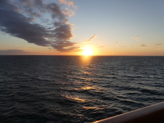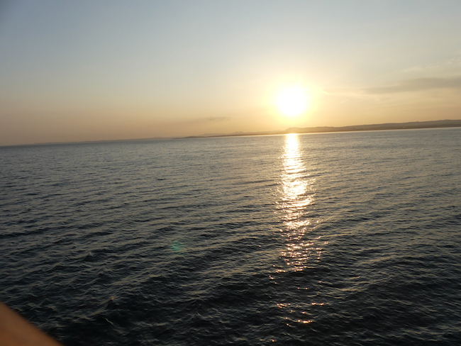 We end the day with our old friends, having dinner in Manfredi’s. AdventureMan and I had the Brodetto, an Italian seafood stew, tasty – some might call it spicy, but it was not hot spicy, just tasty spicy. We shared stories, talked about our time in Saudi Arabia and in Germany, talked about common family issues and advice columns, and we laughed a lot. It was a delightful way to end a wonderful day. Below is our sunset en route to Kirkwall, in the Orkney Islands!